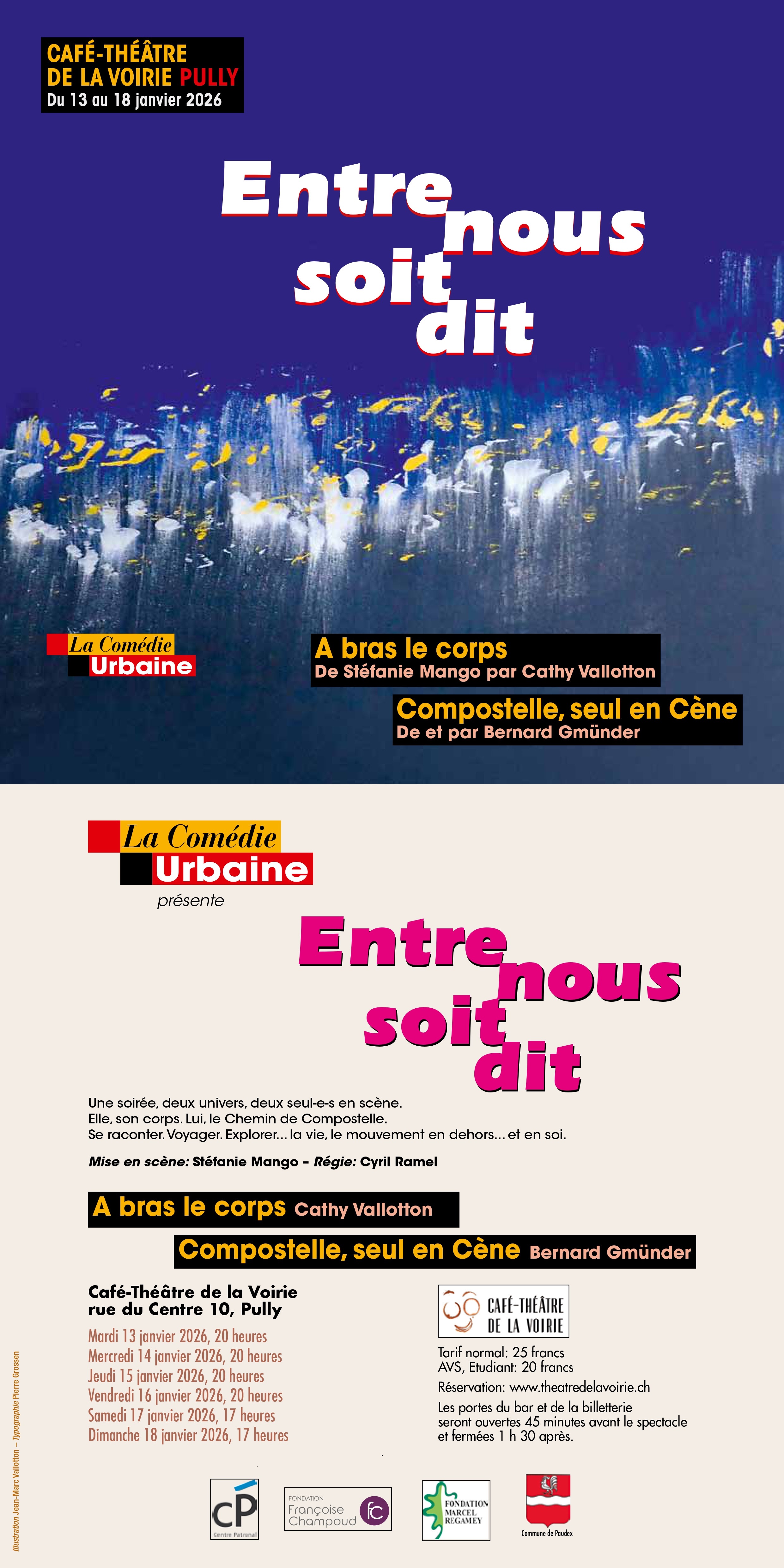 Deux amis de longue date à la ville comme à la scène qui se dévoilent le temps d’une soirée. Se raconter. Voyager. Explorer. Elle son corps, lui le Chemin de Compostelle. Deux récits intimistes où l’on ne se cache pas, où l’on offre au public un peu de son humanité pour émouvoir, faire rire, inspirer. Une héroïne, un héros du quotidien qui touchent par leur regard sur la vie et sur le mouvement… en dehors et en soi.